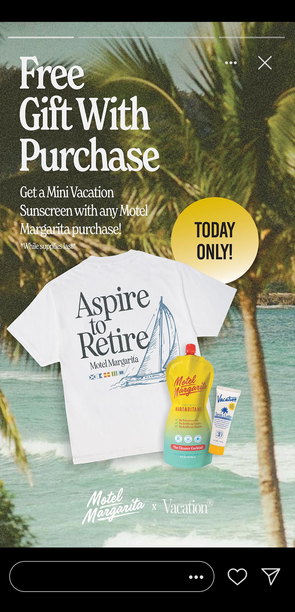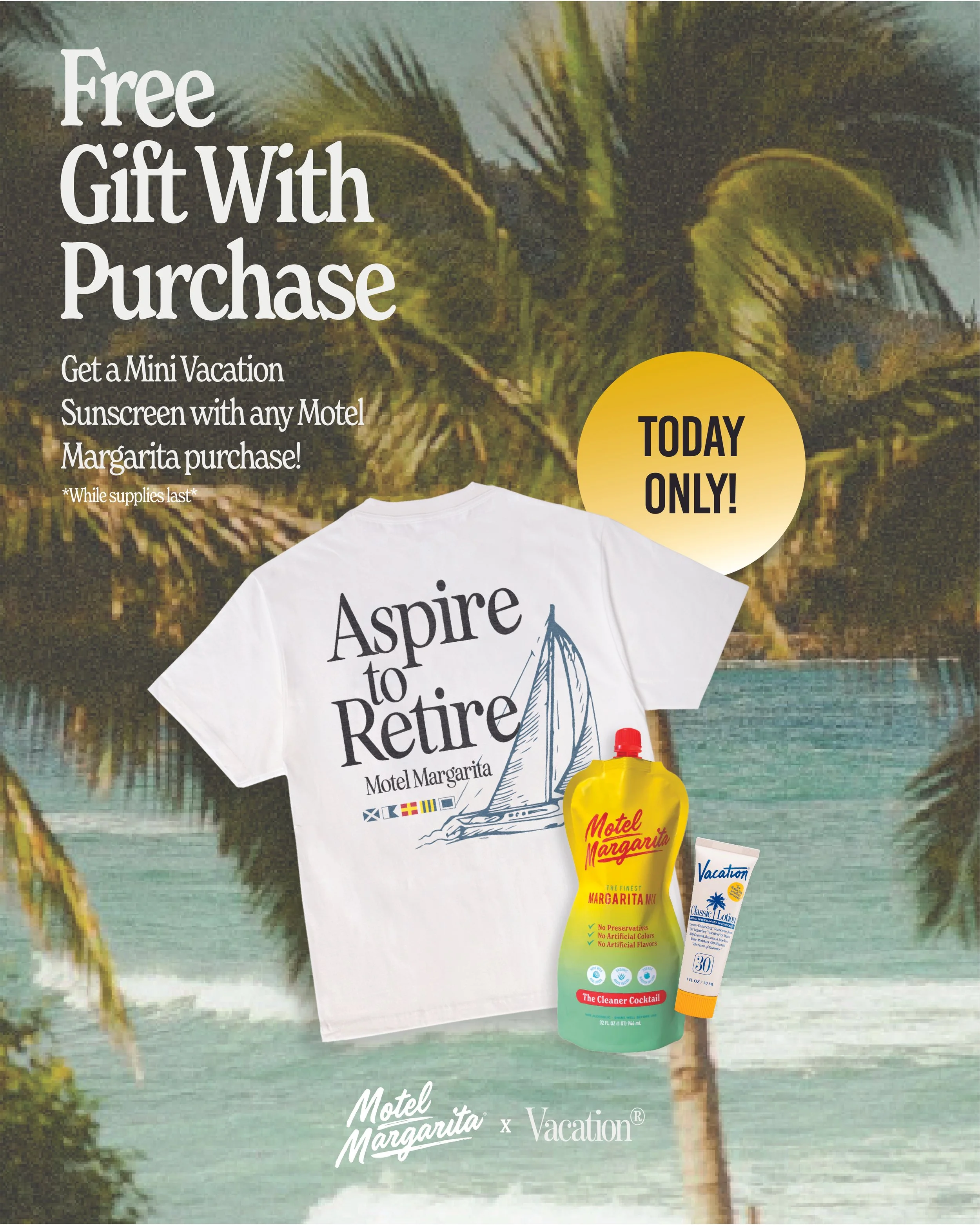 Social media and email campaign created for the Motel Margarita × Vacation Sunscreen collaboration. The goal was to promote a limited-time gift-with-purchase offer through bold, tropical visuals that captured the fun, vacation-ready energy of both brands.